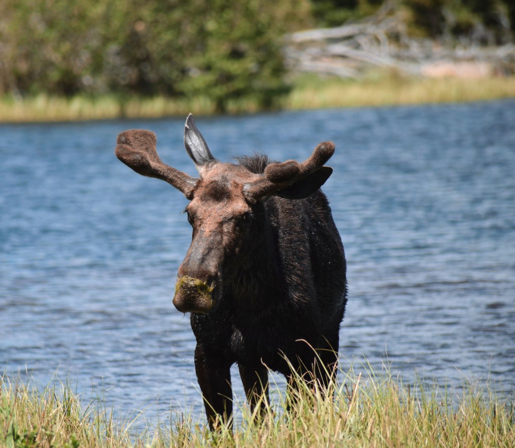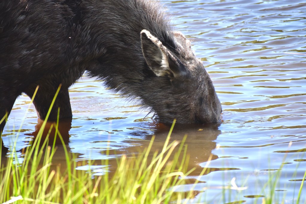 She was so quiet and peaceful, minding her own business, wanting a little snack in her lake…. But oh, look who’s here, an even bigger moose.